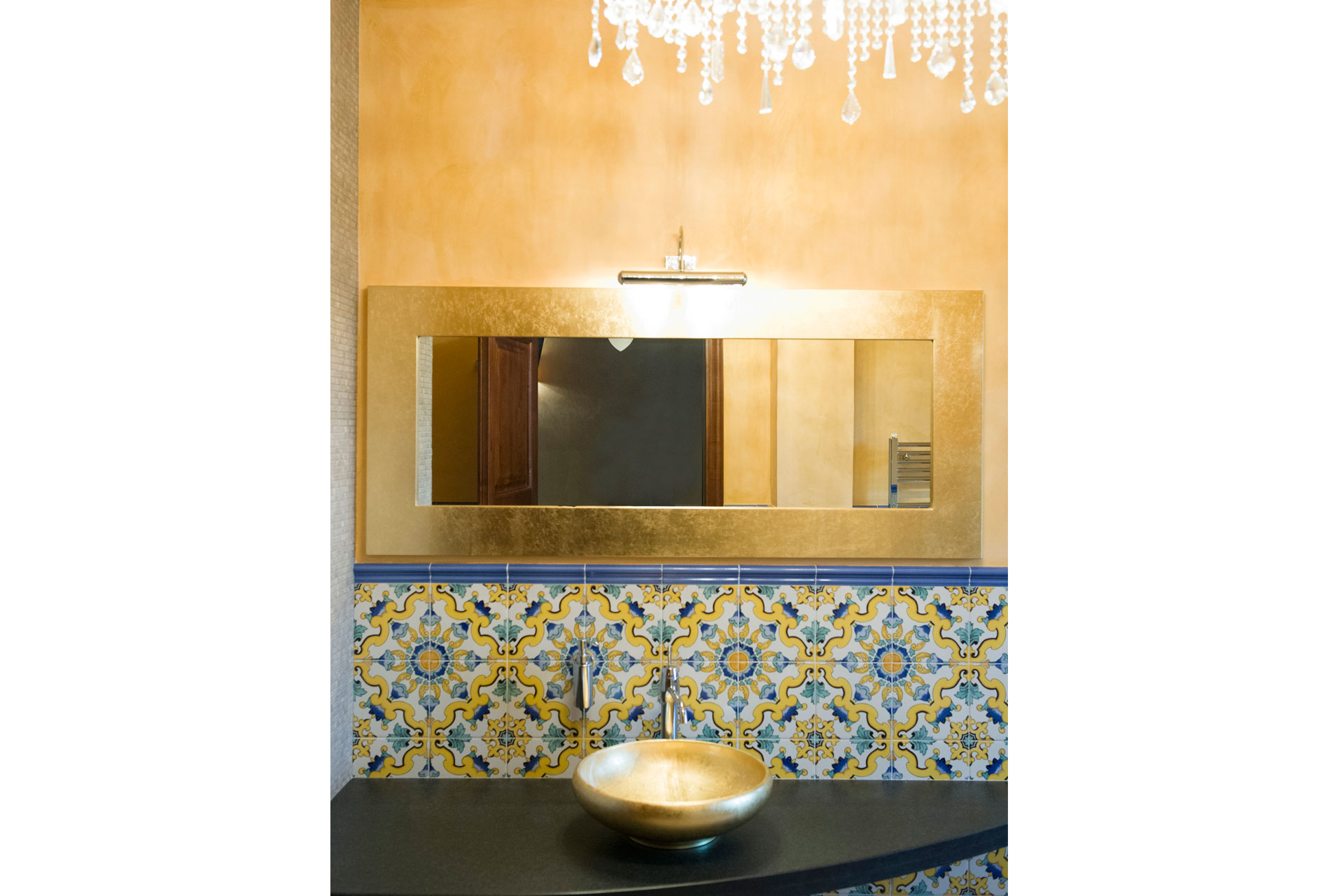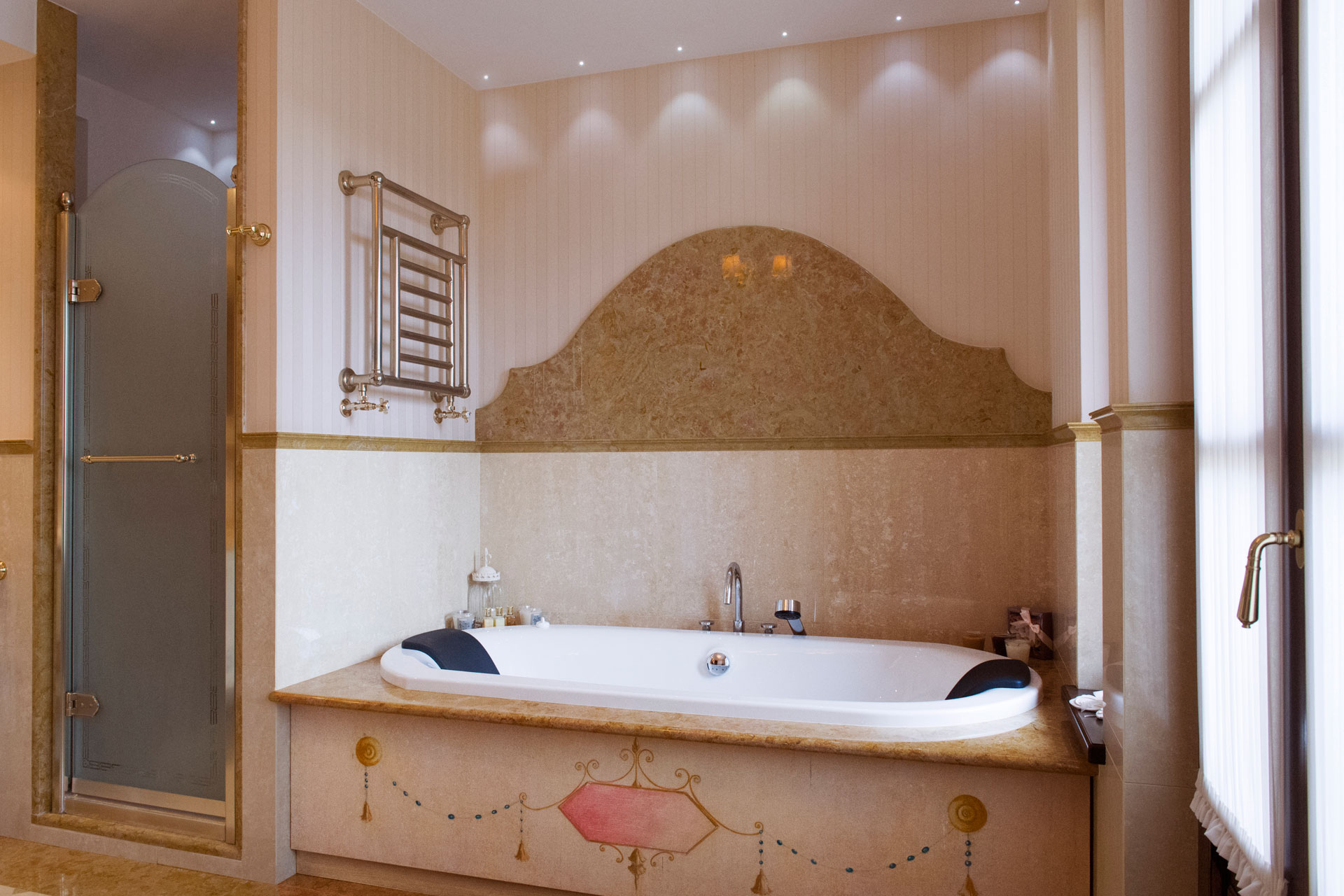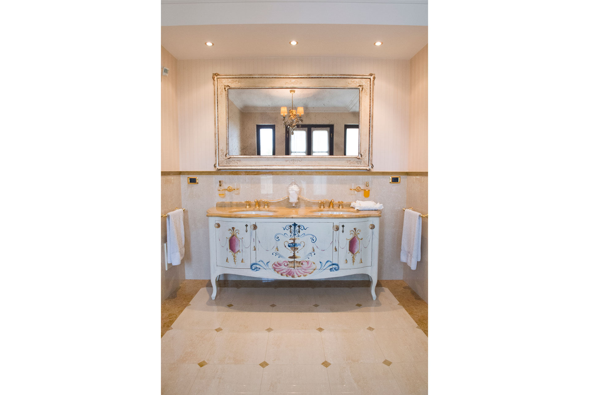 marmo in tonalità della terra si alternano a carte da parati francesi.